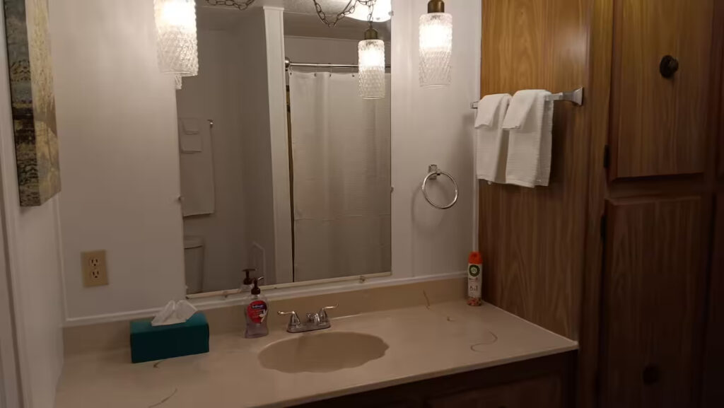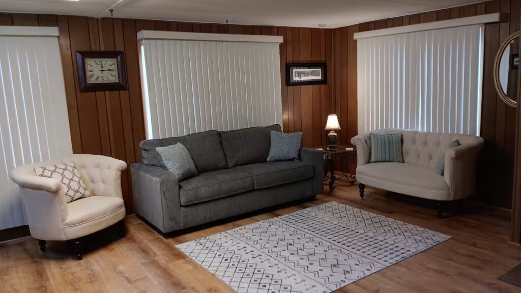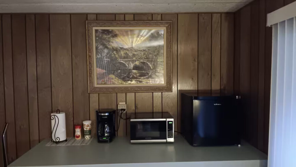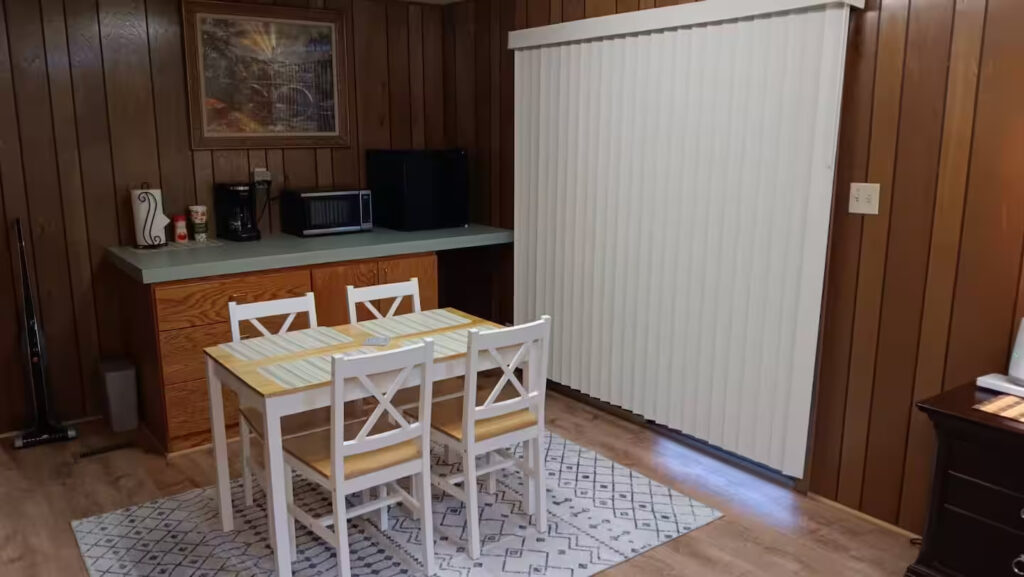 This cabin offers lots of natural light (that can be dimmed with light dimming shades). It features a dining area, living room, bedroom, and bathroom. There is a kitchen with a stove, coffee pot, fridge, and microwave. Wifi and Fire Stick TV are available for your enjoyment.