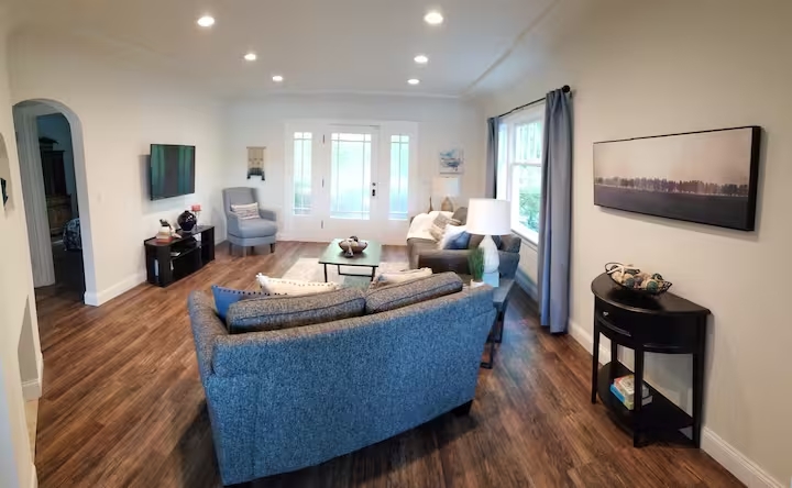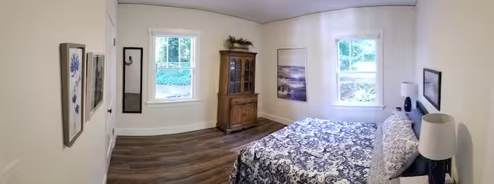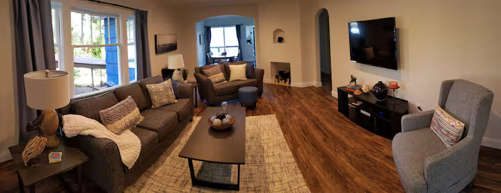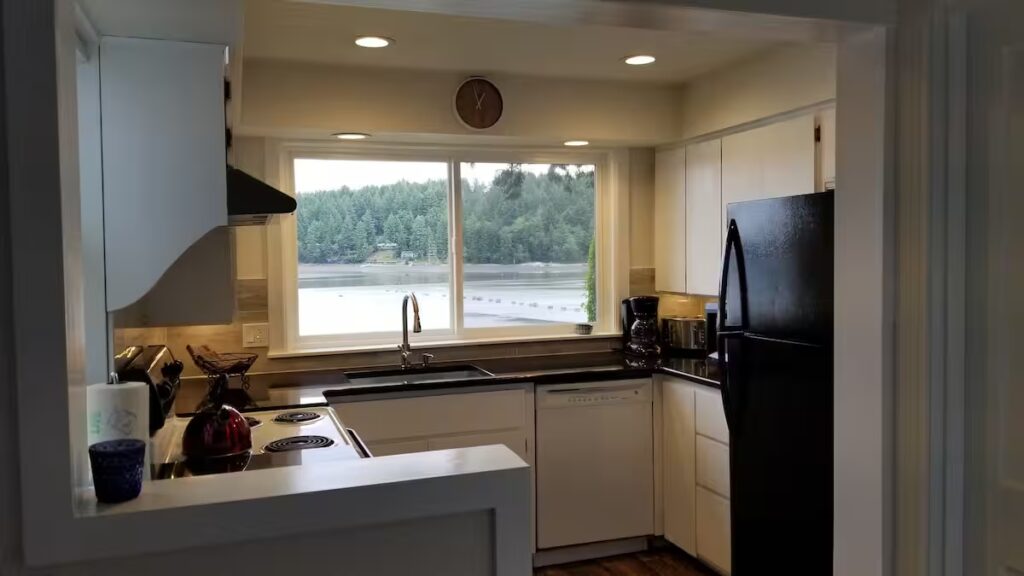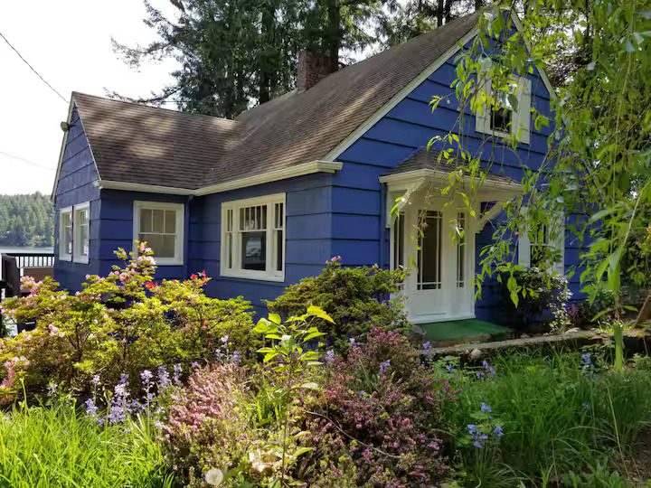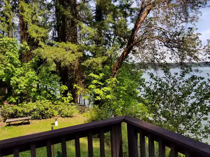 A welcoming recently renovated waterfront 3-bedroom 1930s era house on Eld Inlet that sleeps 8 people. Enjoy wifi, smart TVs, a kitchen with excellent amenities, a dining room, an office, a dining room, and a comfortable living room.